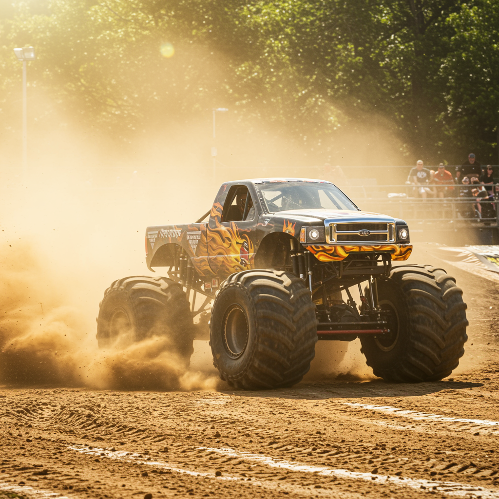 A thrilling photograph captures the dynamic motion and powerful presence of a monster truck hurtling toward the camera, emphasizing the incredible dynamic range. The scene is a vibrant display of dust and dirt flying through the air, with the truck’s oversized wheels churning up the terrain. Sunlight glints off its metal exterior, highlighting the intensity and energy of the moment, while providing a stunning contrast between the truck's bold colors and the natural backdrop. This high-octane sports shot encapsulates the raw excitement and adrenaline of the event, drawing viewers into the heart of the action.