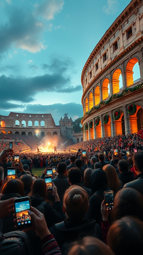 A throng of spectators clutching their smartphones, eagerly capturing the adrenaline-charged spectacle of gladiators clashing in the ancient Roman Colosseum, rendered with hyper-realistic detail. The scene blends the grandeur of the Roman Empire with whimsical Xmaspunk elements—festive lights adorning armor, and wreaths intertwined around the ancient stone arches. The crowd, a vibrant tapestry of modern and antiquity, shimmers with excitement under an azure sky, with stylized details enhancing the atmospheric tension. This fusion captures the timeless thrill of the arena, encapsulated in an ultra-realistic photograph.