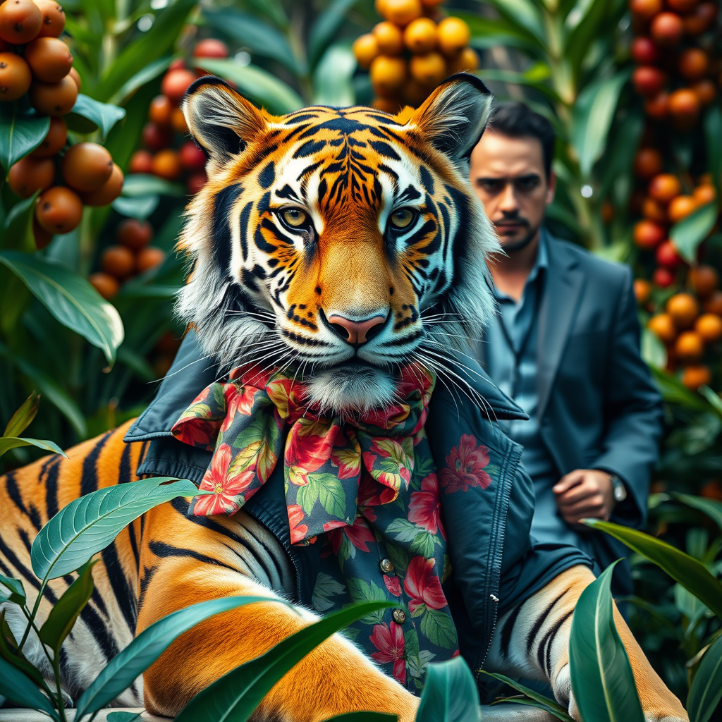 A tiger adorned in a stylish jacket and a brightly patterned Hawaiian floral shirt, with a colorful scarf around its neck, lounges in a jungle setting. Lush plants and leaves form the backdrop as a man in a sleek jacket stands nearby, adding a touch of mystery characteristic of Christian W. Staudinger's influence and captured in the style of classic animal photography. The scene is envisioned as an album cover, exuding a sense of maximalism with bold eyeliner emphasizing the tiger’s eyes. Influenced by L. Frank Baum’s whimsical storytelling, the background is enriched with vibrant fruits, creating a panoramic view shot in RAW candid cinema. The image is captured with a 16mm cinematic camera and color graded with Portra 400 film, highlighting remarkable colors and an ultra-realistic depiction of the tiger’s textured skin. The detailed pupils and visible skin details add to the realistic portrayal, with skin fuzz and dry skin noise enhancing the tactile feel. Despite the cinematic quality, the essence of the jungle remains authentic, steering clear of elements like cloned faces, extra limbs, or distorted proportions. The overall composition avoids the pitfalls of video game aesthetics or 3D renders, focusing instead on a vivid yet grounded representation.