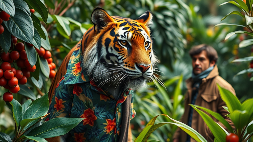 A tiger donned in a vibrant Hawaiian floral shirt paired with a stylish jacket and scarf stands amidst a lush jungle setting, surrounded by verdant plants and leaves. Nearby, a man dressed in a trendy jacket observes the scene, embodying Christian W. Staudinger's flair. The composition evokes animal photography fit for an eclectic album cover, blending maximalism with unique style influences inspired by L. Frank Baum. A background sprinkled with tropical fruit enhances the panorama, captured in RAW candid cinema using a 16mm lens. The imagery is meticulously color graded to emulate Portra 400 film, delivering remarkable color and ultra-realistic details. The tiger’s textured skin, detailed pupils, and life-like features, including visible skin fibers and dry skin nuances, are shot through a cinematic camera to enrich the narrative—a brilliant synthesis of documentary realism and fantastical whimsy.
