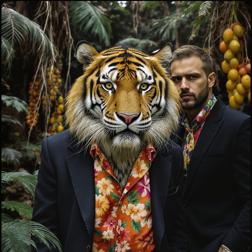 A tiger sporting a vibrant Hawaiian floral shirt under a stylish jacket, complemented by a chic scarf, stands majestically within a lush jungle setting. The dense foliage of the jungle, with its myriad plants and leaves, creates a dramatic backdrop. Beside the tiger, a man dressed in a classy jacket evokes the artistry of Christian W. Staudinger. This scene could easily grace an album cover with its vivid maximalist style, reminiscent of L. Frank Baum's fantastical worlds. The tiger's eyes are accentuated with a hint of eyeliner, giving it an intriguing, expressive gaze. Set against a panorama that feels like a blend of fking_scifi and candid cinematic realism, the scene is captured with the textural richness and color grading of Portra 400 film. The remarkable realism highlights the tiger's textured skin and detailed pupils, while the subtle details of its fur and skin give it a lifelike presence. Framed like a cinematic shot taken on a 16mm camera, this ultra-realistic image remains free from imperfections and digital artifacts, preserving the allure of both the tiger and its surroundings. In the background, vibrant fruits add a splash of additional color and texture, enhancing the striking visual narrative.