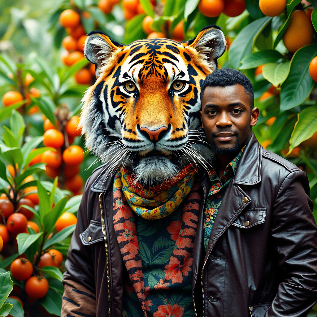 A tiger wearing a stylish jacket, vibrant scarf, and a Hawaiian floral shirt stands amidst a lush jungle setting with verdant plants and leaves. Nearby, a man in a sleek jacket, exuding the artistic energy of Christian W. Staudinger, complements the scene's animal photography vibe. The composition channels the spirit of an album cover, embracing maximalism with rich eyeliner accents. Inspired by L. Frank Baum's storytelling, the background boasts a colorful array of fruits, captured in a panoramic, RAW candid cinema style. Shot on 16mm film, the scene is color graded with Portra 400, emphasizing remarkable hues and ultra-realistic textures. The tiger's intricately detailed pupils and textured skin, with visible fuzz and dry skin nuances, add depth and realism. Framed within a canvas setting, the image evokes a blend of cartoon elegance and 3D awe, avoiding any distortion or disproportion, maintaining a harmonious and artistically enhanced portrayal.