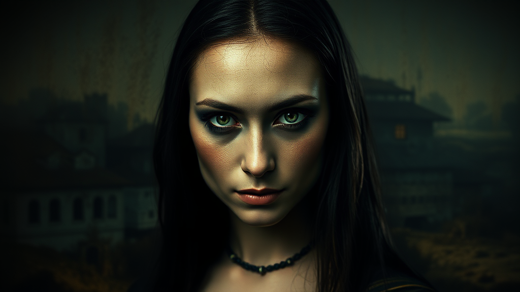 A Tim Burton-inspired version of the Mona Lisa, exuding an air of badassery, with a cinematic and realistic style. Her gaze is direct and piercing, capturing attention with a gothic and dark cinema vibe. The scene is intricately detailed and atmospheric, featuring shadowy tones that enhance the mysterious aura. The composition is dynamic, focusing on a tall, narrow aspect ratio that emphasizes her enigmatic presence.