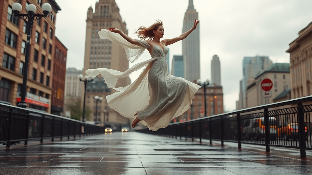 A timeless image captures a model elegantly leaping over a rain-soaked sidewalk in New York, her long, cascading dress fluttering like a butterfly in the breeze, amidst the city's iconic architecture, under a cloudy sky, conveying a sense of freedom and grace.