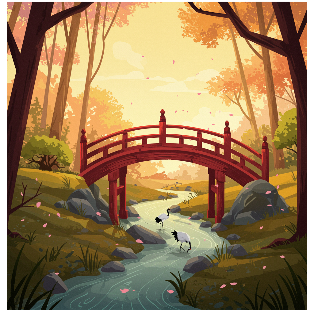 A timeless Japan traditional art style illustration depicting a weathered red wooden bridge gracefully arching over a gently winding stream. The scene is bathed in the soft, warm glow of the golden hour sunlight, casting a surreal, ethereal ambiance. Stylized trees with abstract forms surround the stream, their intricate branches and leaves creating an elegant tapestry of light and shadow. The illustration captures a harmonious blend of nostalgia and modern vibrancy, with subtle creative touches like a pair of cranes wading in the stream and a flutter of cherry blossom petals carried by the soft breeze. This painting embodies the serene beauty and dynamic energy of the scene, creating a captivating visual experience.