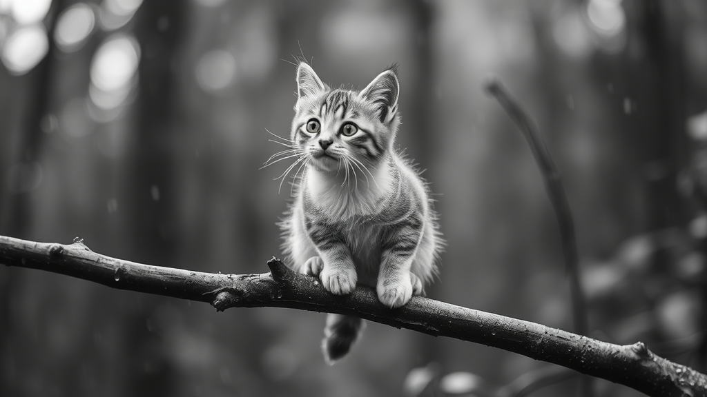 A tiny adorable cat, perched awkwardly on a branch in the rain-soaked woods, its fur glistening with droplets; a whimsical character portrait capturing the cat's playful spirit, with a tilt-shift effect and soft bokeh in the background; the scene rendered in black and white, featuring charmingly imperfect anatomy with an extra limb, yet missing another, adding to its quirky allure.