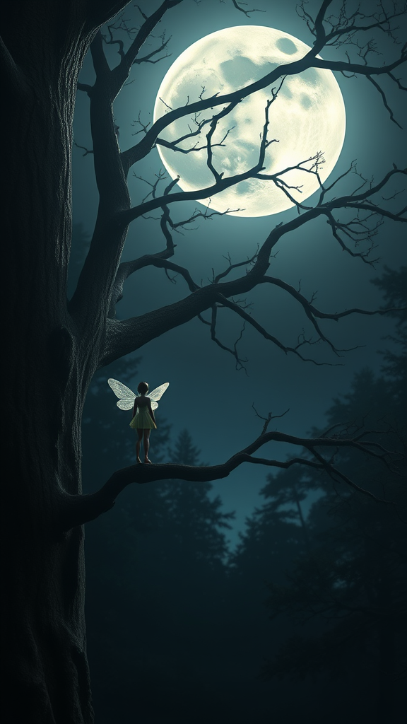 A tiny fairy with delicate wings rests upon the branch of a towering tree, gazing intently at the radiant moon above. The night wood is bathed in ethereal moonlight, resembling an enchanting scene from an epic fantasy. The scene captures the mystical interplay of shadows and light, reminiscent of satellite imagery. In this studio-like composition, the majestic moon looms large, casting its luminescent glow across a landscape teeming with atmospheric beauty. The setting is rich with high-quality details, each element meticulously rendered to capture the fairy’s serene vigil. Realistic textures bring the scene to life, revealing a tapestry of intricate, small details that draw the viewer into an 8k universe of magic and wonder.