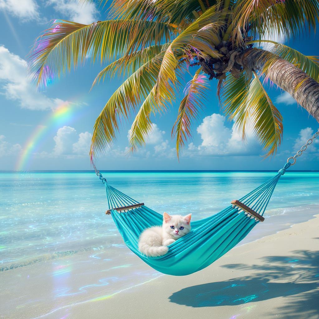 A tiny ivory kitten nestled on a turquoise hammock gently swaying beneath a towering palm tree at a surreal, translucent beach with a shimmering, prismatic sky casting rainbow hues across the sands, the atmosphere imbued with an otherworldly, sunlit glow.