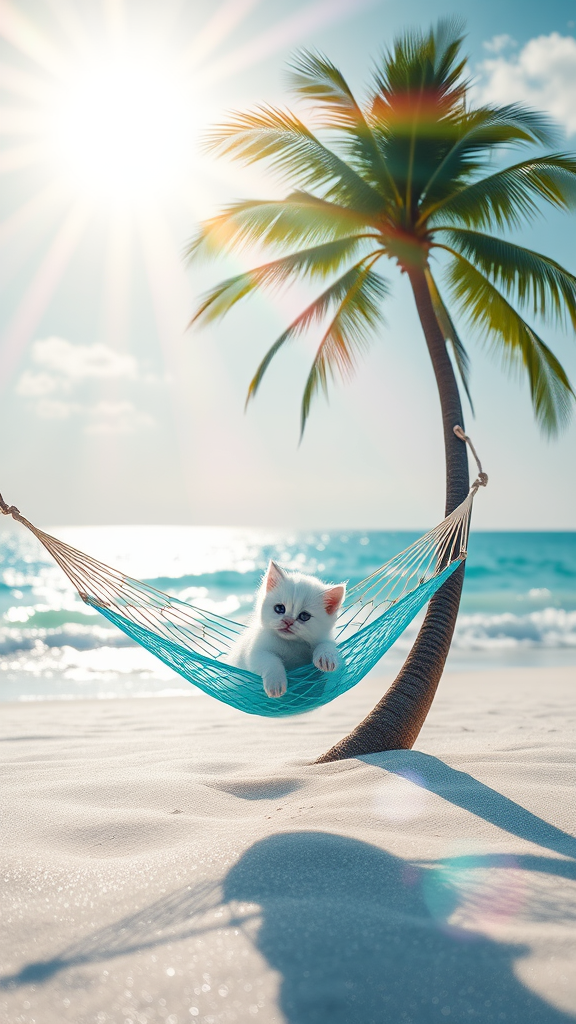 A tiny snow-white kitten nestled on a turquoise hammock swaying gently between two slender palm trees, set against an abstract ethereal beach. The sun casts a warm glow, illuminating the scene with prismatic rays, creating a kaleidoscope of colors in the sky. The shimmering sands appear almost translucent, with waves that reflect the vivid spectrum above, capturing the magical essence of a dreamlike paradise.