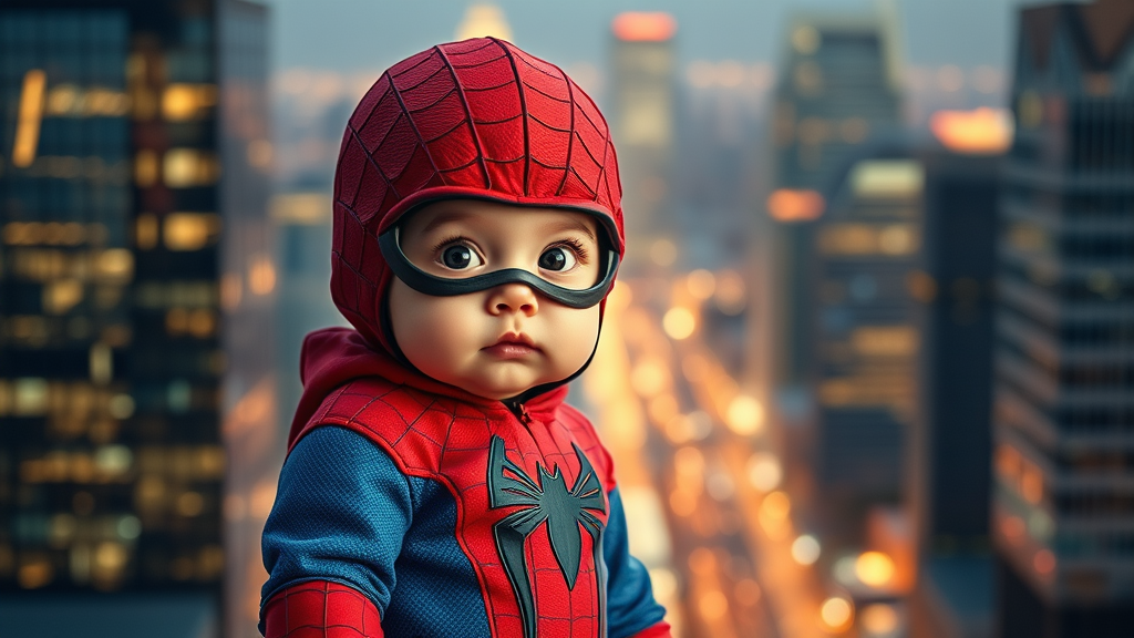 A tiny superhero with a baby face is clad in a miniature version of the iconic Spiderman suit, set against the soft, blurred backdrop of a bustling cityscape. The costume's vibrant red and blue colors pop against the urban expanse, with delicate web patterns intricately detailed. The bright city lights shimmer softly in the background, creating a sense of wonder and excitement as glowing skyscrapers tower above. The small superhero's wide, curious eyes peek through the mask, capturing innocence and determination in one charming glance.