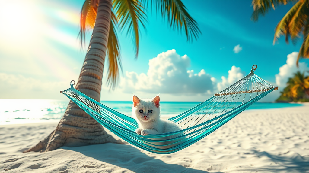 A tiny white kitten nestled on a turquoise hammock swaying gently beside a towering palm tree, set against an otherworldly, semi-transparent beach bathed in sunlight. The sky above is a dazzling display of rainbow-hued light, creating an awe-inspiring and surreal atmosphere.