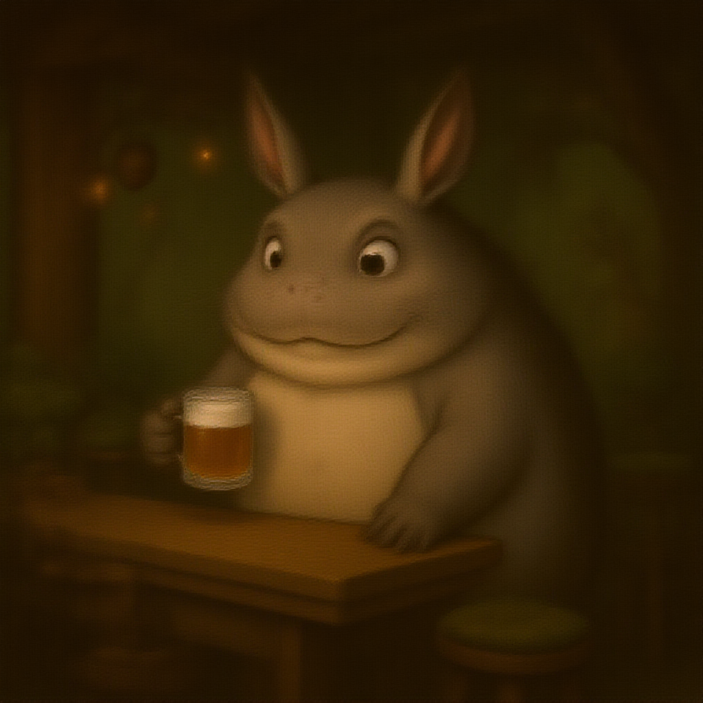 A tipsy totoro clutching a frosty mug of ale, seated at a rustic bar, surrounded by soft, warm cinematic lighting, capturing a blend of Studio Ghibli's whimsical charm and photorealistic detail, set in an enchanting forest tavern where oversized acorns and moss-covered stools replace traditional bar decor.