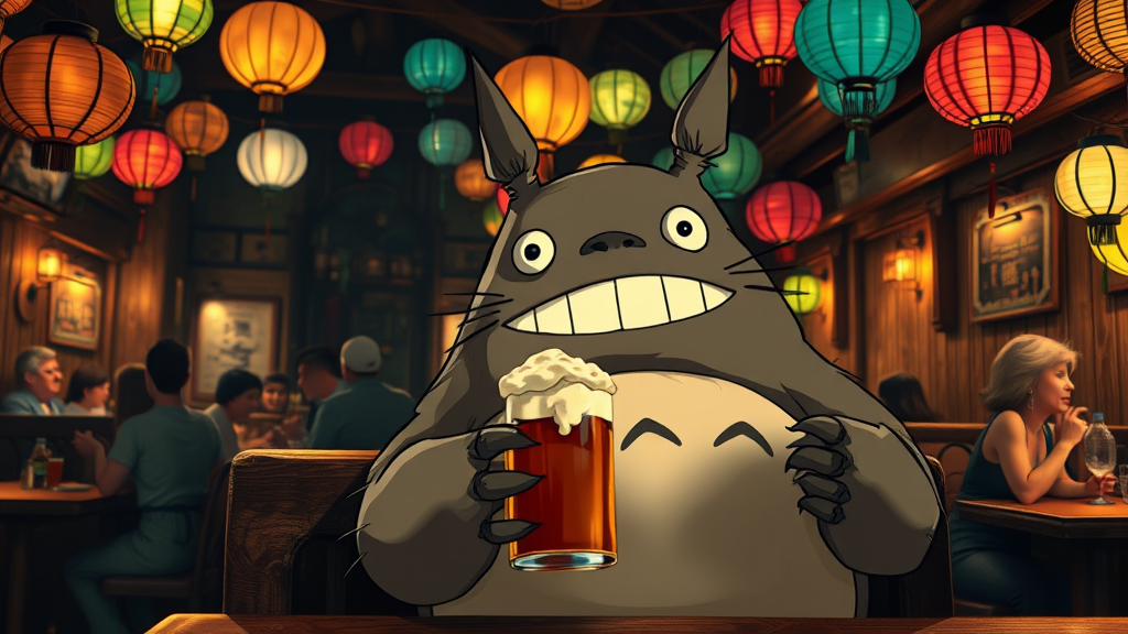 A tipsy Totoro with a frothy mug of beer at a dimly-lit tavern, surrounded by warm, cinematic lighting that casts soft shadows, rendered in photorealistic detail reminiscent of Studio Ghibli art, nestled in a cozy wooden booth with rustic charm, lively patrons in the background sharing laughter and stories, an array of colorful lanterns overhead adding a whimsical touch, --ar 2:3 --q 2 --v 5.