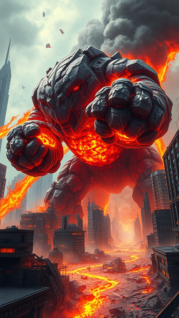 A titanic primordial lava golem rampages through a devastated futuristic cityscape, its molten core fiercely churning beneath a fracturing, rocky exterior. Its enormous, blazing fists leave trails of thick, acrid smoke as it strikes, causing glass and steel towers to melt and crumble into fiery ruins. The once-advanced urban environment is now a sea of twisted metal and scorched earth, with rivers of lava flowing along the cracked streets, turning structures into mere silhouettes against the infernal glow. The chaotic interplay of heat and molten rock against the cold remnants of technology creates a dramatic, apocalyptic scene.