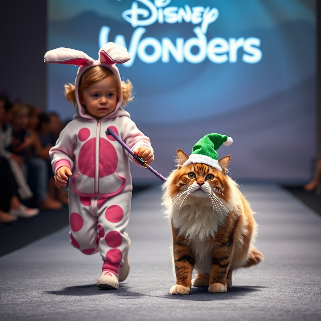A toddler clad in adorable bunny pajamas confidently guides a fluffy pet cat on a leash down the runway at a Disney-themed fashion show, where the cat sports a festive elf hat instead of a Santa Claus hat. The scene is magical, with the logo "Disney Wonders" glowing subtly in the background, adding an enchanting touch to the atmosphere.