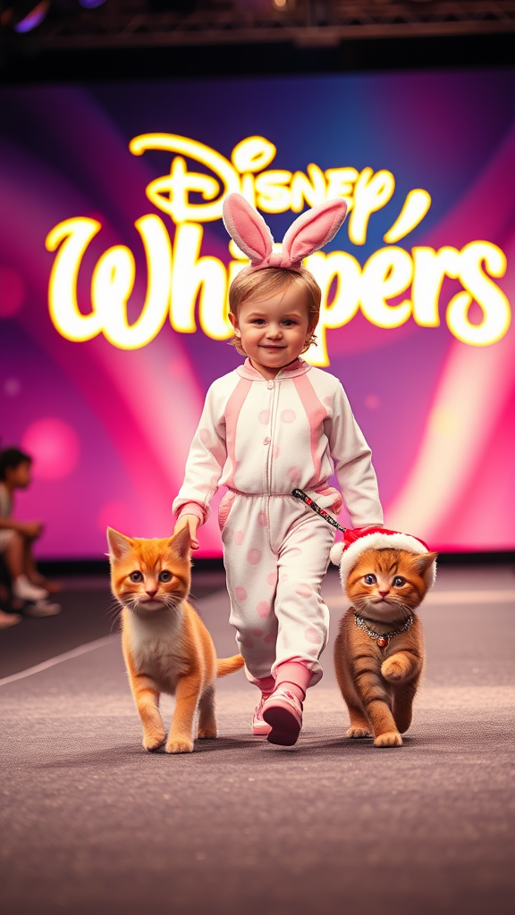 A toddler clad in adorable bunny pajamas parades confidently down a Disney fashion show runway, playfully leading a furry pet kitten on a sparkling leash. The kitten struts beside the child, donning a whimsical Santa Claus hat, its tiny bell jingling with each step. Behind them, the vibrant "Disney Whispers" logo glows brightly in the background, casting an enchanting aura over the magical scene.