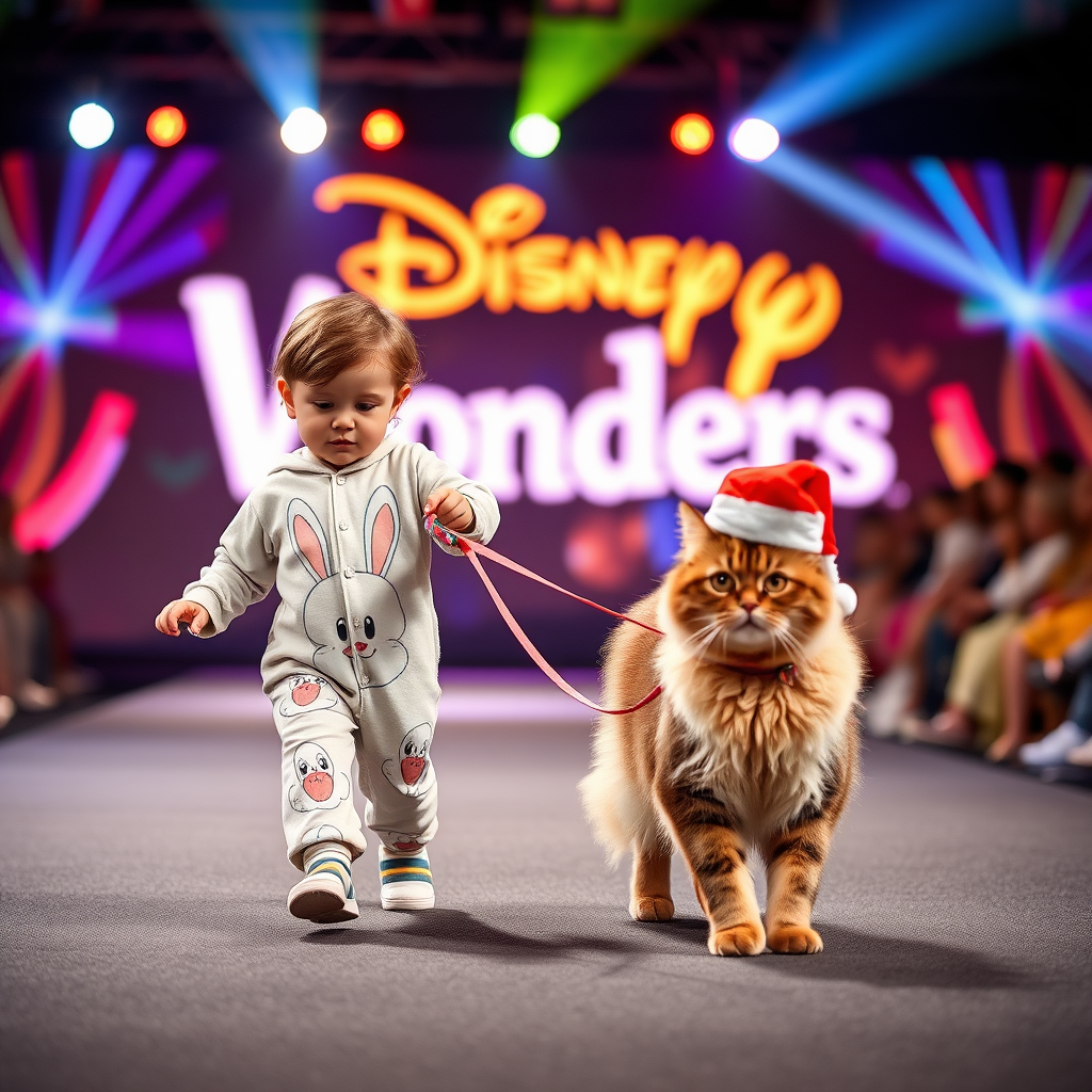 A toddler in adorable bunny-themed pajamas toddles confidently down a Disney fashion show runway, guiding a fluffy cat on a sparkling leash. The cat, strutting with poise, wears a jolly Santa hat tilted slightly to one side. Behind them, the vibrant logo "Disney Wonders" shines brightly, casting a magical glow over the scene. Bright, colorful lights dance overhead, adding to the whimsical atmosphere, as the audience delights in the charming duo's delightful display.