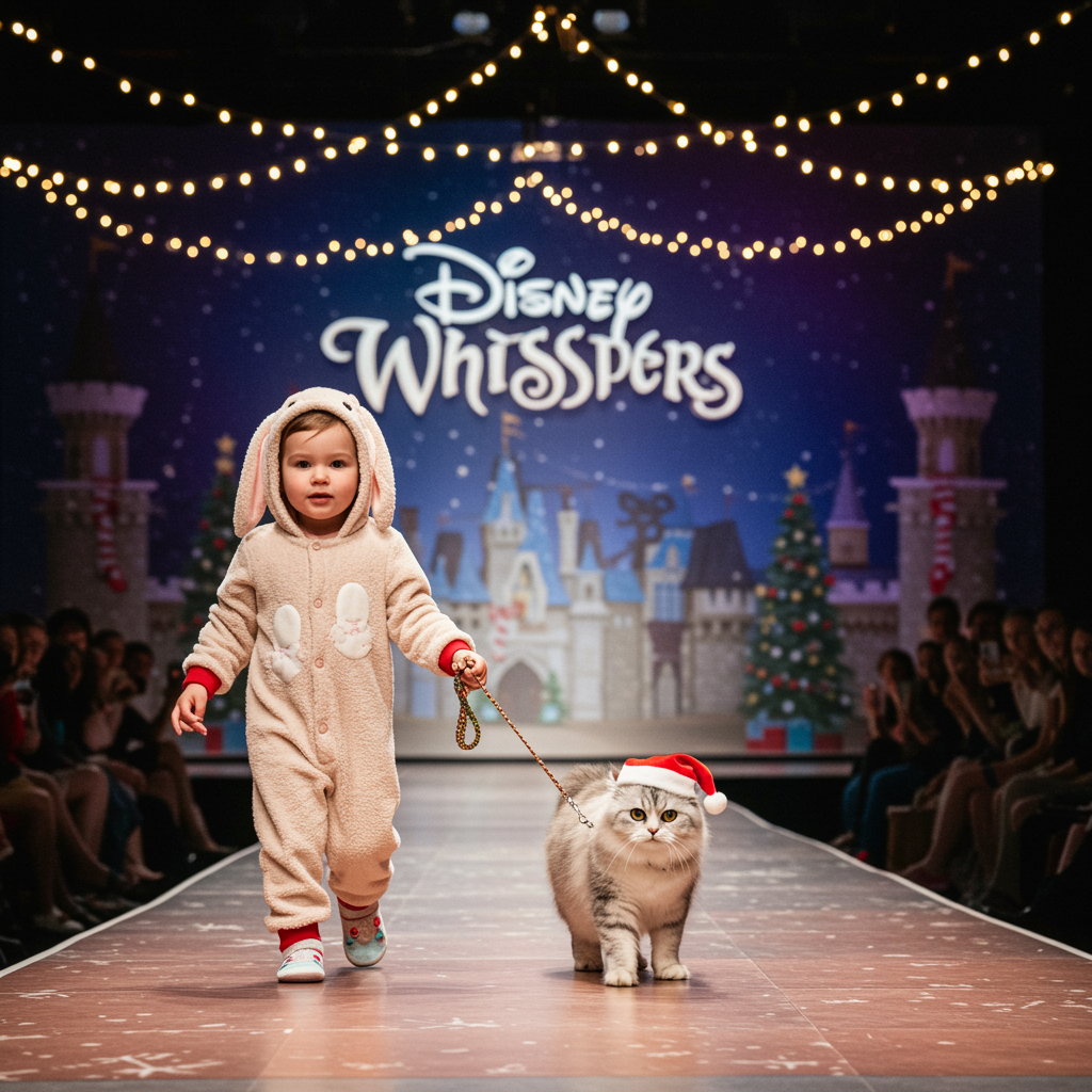 A toddler in cozy bunny pajamas toddles confidently down a whimsical Disney-themed fashion runway, gently guiding a fluffy cat on a sparkling leash. The feline companion prances elegantly, sporting a festive Santa Claus hat with a tiny bell jingling on top. In the background, an enchanting display of fairy lights illuminates the show-stealing logo, "Disney Whispers," casting a magical glow over the scene.