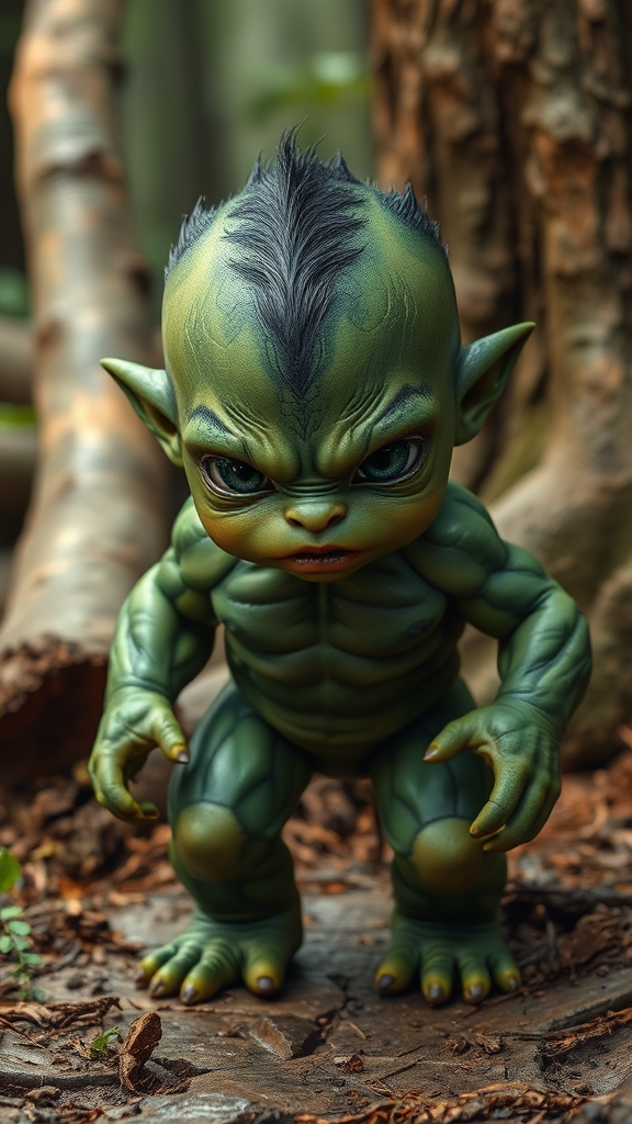 A toddler-sized creature with rippling green muscles and intense, expressive eyes, its skin a marbled mix of emerald and jade hues, capturing the essence of raw power in a cinematic, hyper-realistic style; the surrounding environment hints at its incredible strength—several large trees toppled nearby and the ground beneath its small feet slightly cracked.