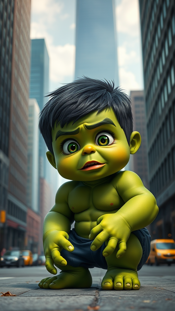 A toddler-sized Hulk, with vibrant green skin, expressive eyes full of curiosity and mischief, rendered in high-definition realism, set within a dynamic, cinematic urban landscape, towering buildings providing a dramatic backdrop to his playful yet powerful presence.