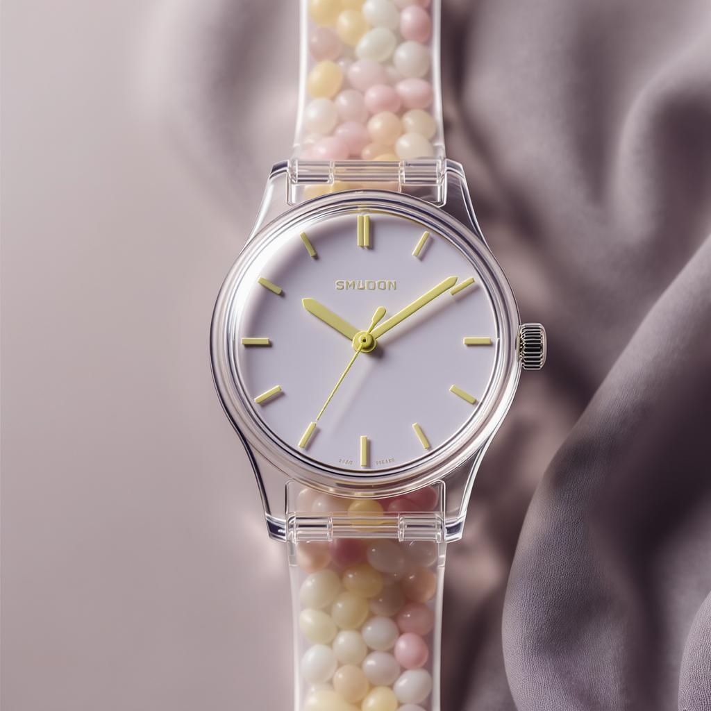 A top-down cinematic fine art photoshoot captures a professional studio watch crafted from transparent vinyl and translucent glass. The watch, filled with vibrant small jelly beans, boasts a high refractive index, with frosted glass elements. It features a pastel color palette highlighting a soft yellow accent, echoing a Dieter Rams-inspired design. The overall composition is subtly different with the incorporation of occasional gentle lavender shades, enhancing its elegant and whimsical appeal.