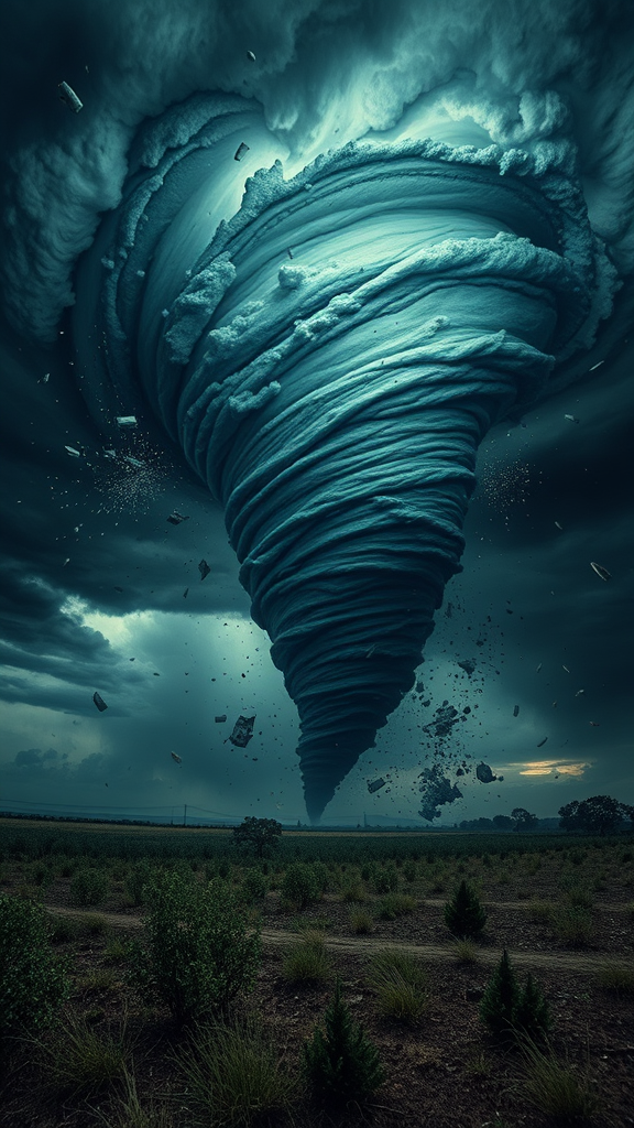 A tornado, as dark as midnight, spirals menacingly toward the landscape, entwined with airborne debris that dances wildly through the atmosphere; an exquisite focus on details renders it a breathtaking masterpiece. This fusion of photorealism and magical realism blossoms into hyper maximalism, capturing every intricate nuance. A sense of awe and wonder permeates the scene, seamlessly merging the untamed power of nature with a visionary artistic expression, as if a photograph in vivid motion.