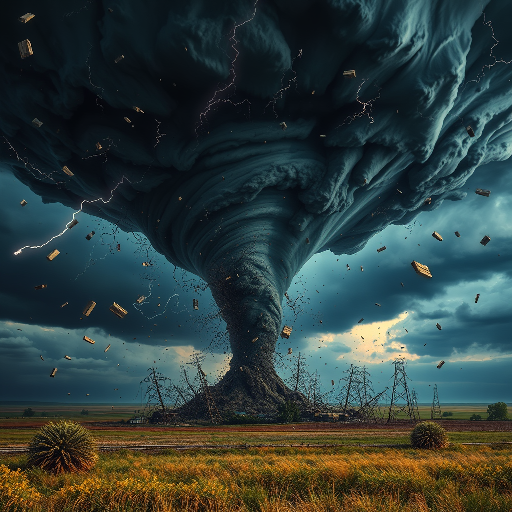 A tornado, as dark as the midnight sky, swirls with ferocious intensity across the landscape, sending debris spiraling through the air with electrifying chaos. This breathtaking masterpiece captures photorealism fused with magical realism, a hyper maximalist portrayal replete with intricate details. It evokes a profound sense of awe and wonder, seamlessly blending the raw power of the natural world with artistic vision, as if nature itself has become a work of art in a stunning piece of photography.