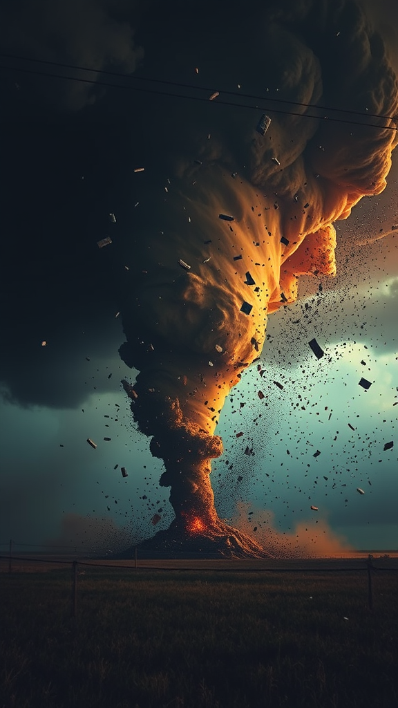 A tornado, ominously dark as the abyss, twists its way across the landscape, scattering debris in chaotic elegance through the air; every fragment captured with stunning precision and dazzling intricacy. This breathtaking masterpiece melds photorealism with magical realism, offering a hyper-maximalist portrait of nature’s raw power. An atmosphere imbued with awe and wonder emerges, seamlessly merging the visceral ferocity of the storm with an artist’s inspired vision, blurring the lines between reality and imagination in an extraordinary photographic spectacle.