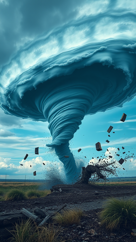 A tornado, swirling and ominous, emerges like an inky specter against the horizon, churning across the landscape with an awe-inducing ferocity. Broken fragments of earth and sky intermingle, whirling through the air as the vortex draws them into its chaotic dance. The scene, rendered with astonishing detail, captures the raw power and intricate beauty of nature, blending photorealism with a touch of magical realism. This hyper-maximalist vision invites viewers into a breathtaking tableau where the wild forces of nature merge seamlessly with the refined artistry of a masterpiece. A sense of wonder permeates the image, evoking both the majesty and mystery of the natural world vividly portrayed through an artist's lens.