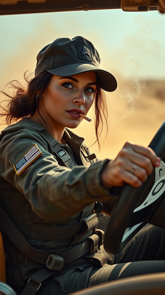 A tough and determined woman clad in tactical combat gear grips the wheel with one hand as she navigates a rugged off-road jeep through the dusty terrain. A lit cigarette dangles from her lips, the smoke curling upwards in the breeze, her eyes focused and piercing under the brim of her cap, as the powerful engine rumbles beneath her.
