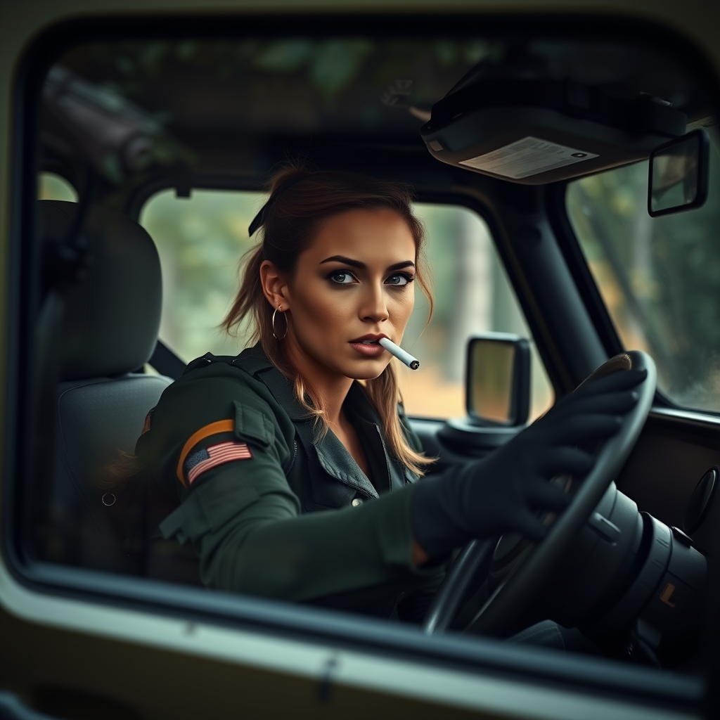 A tough-looking woman wearing tactical gear is behind the wheel of a rugged jeep, a lit cigarette hanging casually from her lips as she navigates through a dense forest, her keen eyes scanning the terrain ahead.