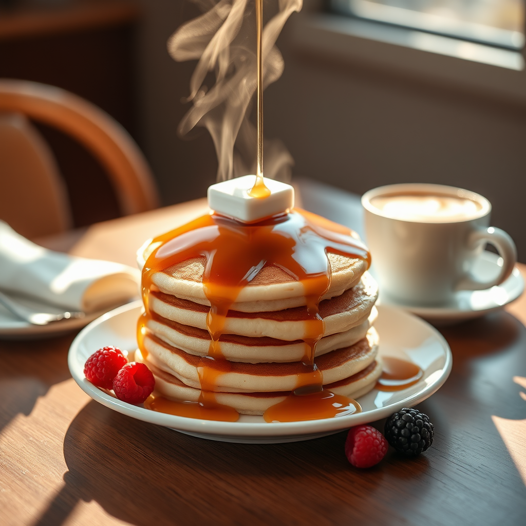 A tower of fluffy pancakes rests on a pristine white plate, draped in a generous cascade of amber maple syrup. Wisps of steam rise gently from the warm pancakes, suggesting their fresh-off-the-griddle allure. Nearby, a cappuccino sits gracefully, its surface adorned with delicate foam art. A pair of vibrant berries adds a splash of color to the serenity of the scene. Sunlight filters through, casting a radiant play of glares across the table. The image is richly toned with professional color grading, bearing soft shadows and a seamless, harmonious composition lacking harsh contrasts. Every detail is rendered with clean, sharp focus, achieving food photography perfection. The bokeh effect in the background adds a dreamy depth, enhancing the hyper-realistic feel of the photograph. Warm, gentle lighting envelops the scene, captured with an f-stop of 2.0, and framed in a portrait aspect ratio of 9:16, exuding a cozy, inviting atmosphere.