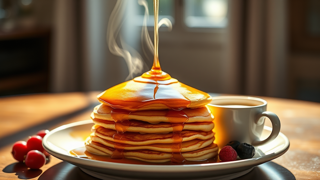 A tower of golden pancakes rests elegantly on a ceramic plate, bathed in a cascade of amber maple syrup that glistens luxuriously under the gentle morning light. Wisps of steam dance upwards, weaving through the air with the aroma of freshly made breakfast. Beside it, a steaming cup of cappuccino sits invitingly, crowned with delicate latte art. A pair of lustrous berries, one ruby red and the other midnight blue, add a splash of color adjacent to the pancakes. The room is filled with a soft sunlit glow, casting gentle halos and subtle shadows, creating a serene and inviting atmosphere. The scene is captured in luscious, hyper-realistic detail with professional color grading and a beautifully bokeh-ed background, all bathed in a warm, cozy ambiance.
