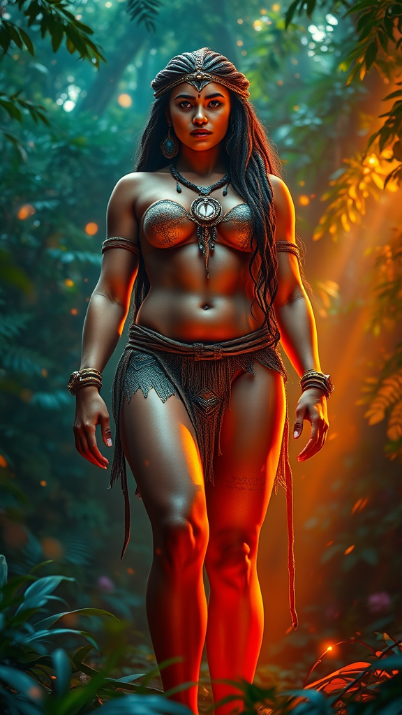 A towering amazon woman stands majestically in a lush, glowing forest, surrounded by delicate fairy lighting. Her powerful presence is captured in ultra detail, with photorealistic rendering that highlights her muscular form and intricate tribal markings. Bright colors dance around her, as volumetric rays of light filter through the dense canopy, casting an ethereal glow on her skin. The scene is alive with vibrant hues and shimmering hdr effects, creating a magical atmosphere that feels both ancient and fantastical.