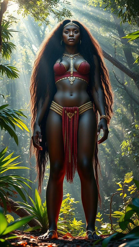 A towering amazonian woman standing majestically in a lush, vibrant forest bathed in dreamy fairy lighting, captured in ultra-detailed, photorealistic style. She is surrounded by an explosion of bright colors as the sun filters through the canopy, casting mesmerizing volumetric rays of light all around. Her powerful presence is softened by the ethereal glow of the HDR-enhanced scene, which adds a mystical aura to the captivating tableau.