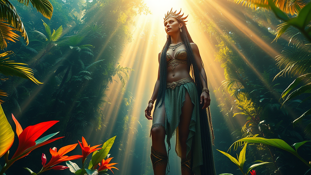 A towering Amazonian woman stands majestically in a lush, vibrant jungle, her presence both commanding and ethereal, enveloped in intricate details that capture her strength and grace. The scene is bathed in a magical fairy-like light, casting a warm, enchanting glow around her. Bright, vivid colors paint the landscape, enhancing the surreal beauty of the moment. Volumetric rays of sunlight filter through the dense canopy above, creating a dynamic play of light and shadows. The high dynamic range brings out every texture and hue, rendering a photorealistic masterpiece that blurs the line between reality and fantasy, set in a captivating 9:16 aspect ratio.