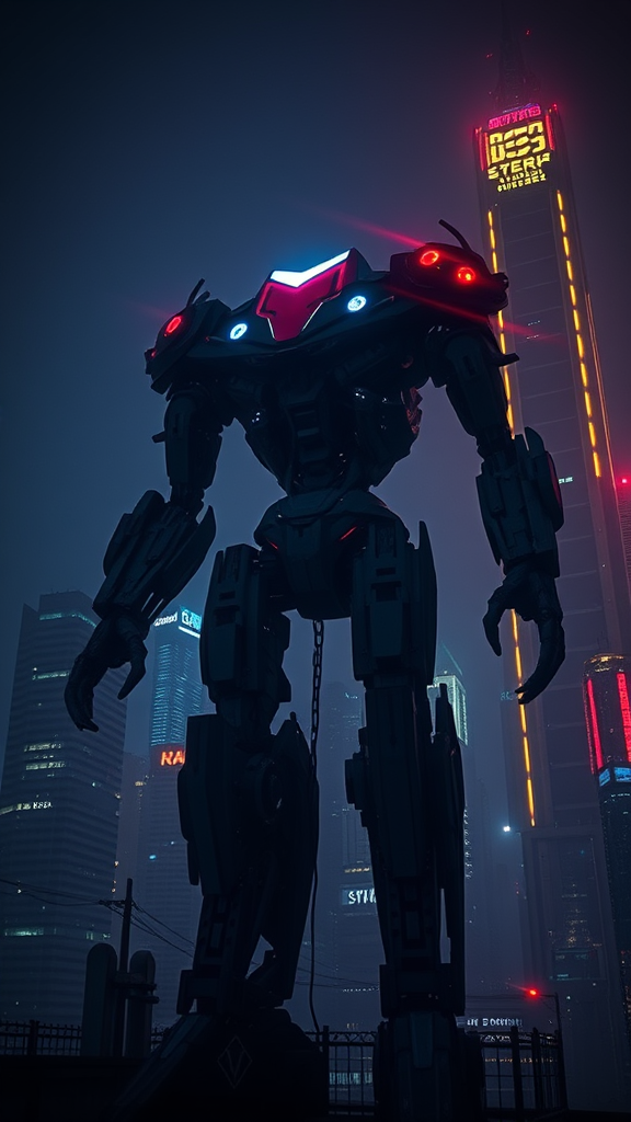 A towering and ominous Cyberpunk robot looms against a neon-lit futuristic city skyline, exuding a malevolent aura. The night envelops the scene in darkness, creating a gritty and sinister atmosphere captured through a mirrorless camera with an ultra-wide lens. The low realism level adds a surreal touch, with a 2.35:1 aspect ratio emphasizing the vastness of the cityscape. Camera settings: manual mode with a shutter speed of 1/60, aperture at f/2.8, and ISO 3200. The final image undergoes color grading to enhance the noir tones, a subtle vignette to draw focus, and light leaks to add a touch of unpredictability to the scene.