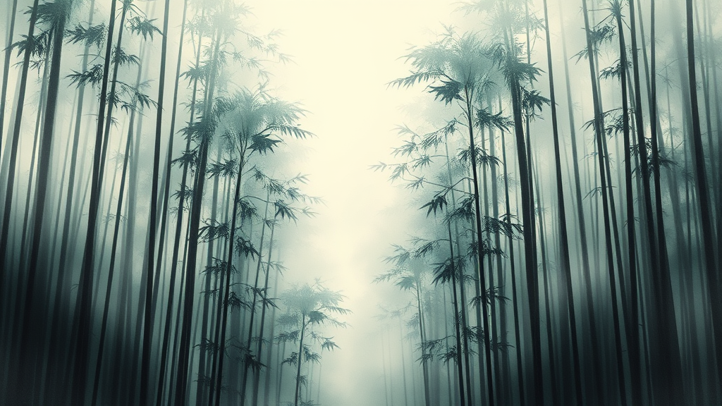 A towering bamboo forest shrouded in mist, each stalk etched with delicate brushstrokes, set against an elongated vertical canvas, evoking a sense of serene majesty. Soft charcoal grays gradually blend into deep emerald greens, capturing the transcendent peacefulness of a quiet, hidden grove. Slight touches of white ink suggest the play of light and shadow, giving life to the tranquil scene. The atmosphere is ethereal and timeless, merging traditional artistic technique with a seamless modern elegance.