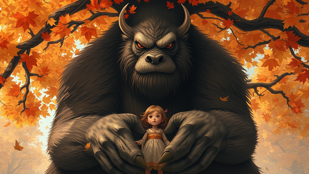 A towering beast gently cradles a small girl in its massive arms, its fierce eyes softened with a protective gaze, as they stand beneath a canopy of autumn leaves, contrasting their peculiar companionship with the vivid colors of nature.