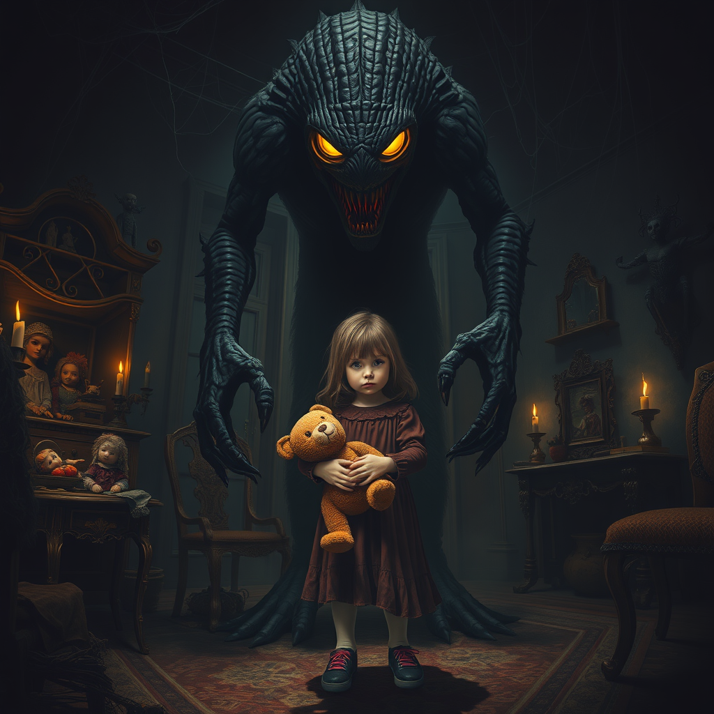 A towering creature with glowing eyes protectively looms over a little girl clutching a worn-out teddy bear amidst the ominous setting of an eerie old mansion. The dimly lit room is filled with antique furniture, and cobweb-covered shelves lined with eerie dolls. The atmosphere is thick with foreboding, as shadows dance across the walls, casting sinister shapes that seem alive in the flickering candlelight.