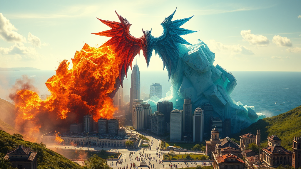 A towering elemental sentinel looms over a city caught in chaos, poised as a guardian balancing destruction and preservation. Its left side seethes with wild, untamed flames, flickering with vibrant reds and oranges, while its right side is encased in shimmering, impenetrable ice armor, radiating a serene blue chill. With massive wings outstretched, it stands at the heart of a city split between a raging inferno and a frozen tundra, embodying the eternal struggle between fire and ice. Amidst this elemental turmoil, human activity continues with determined resilience; citizens go about their mundane lives amidst clear skies and calm oceans. Green landscapes frame the horizon, untouched nature juxtaposed against the city's functionality. Sunlight pours down, illuminating vibrant flora and ordinary wildlife that exist in harmony with advanced, yet unaffected technologies. Buildings remain steadfast, defying the chaos with a battle-worn elegance. The sentinel's asymmetrical elemental form epitomizes this delicate balance, capturing the essence of both serene beauty and tumultuous power in one majestic entity.