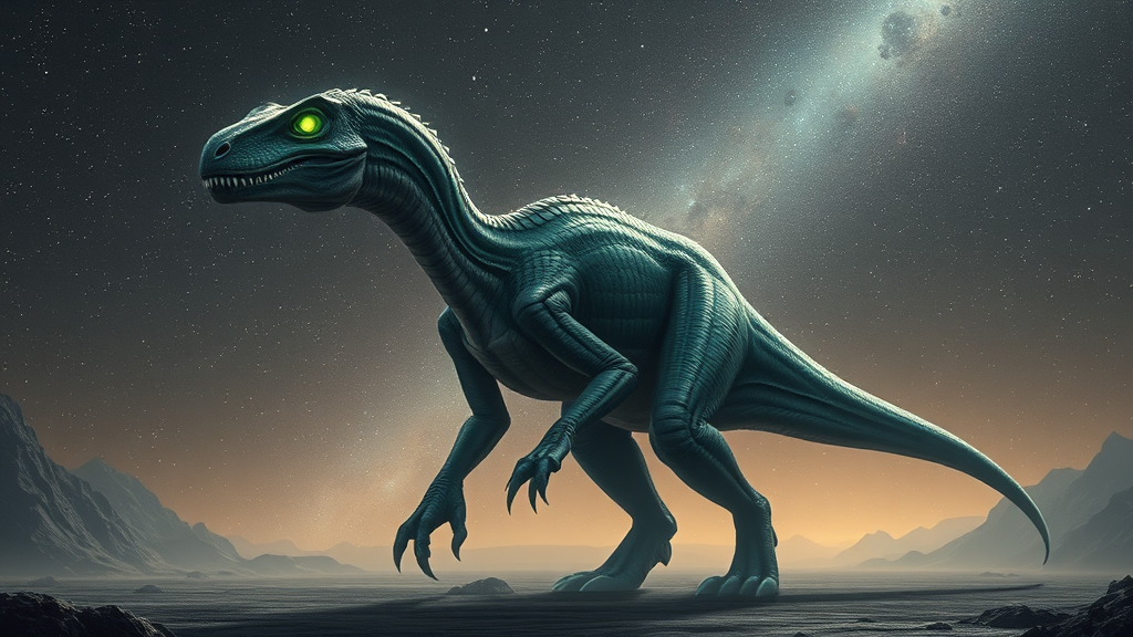 A towering extraterrestrial dinosaur with bioluminescent scales and an elongated neck, set against a starry extraterrestrial landscape, its eyes glowing with intelligence and its claws adapted for an alien terrain, all in an unrefined and primal style.