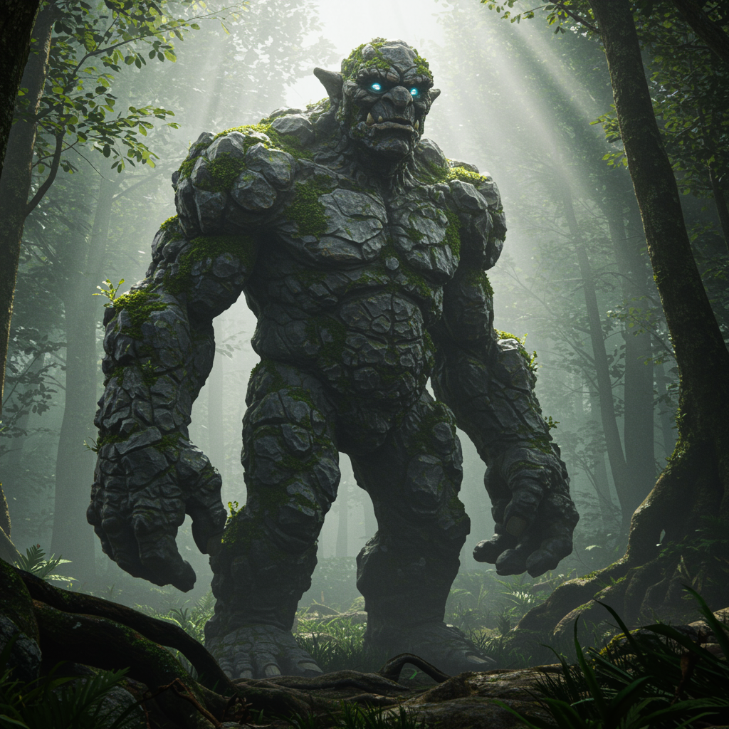 A towering fantasy troll stands amidst a misty forest, its skin a textured masterpiece of rocky patterns and moss, rendered in hyper-realistic detail. Sunbeams break through the dense canopy above, casting dramatic HDR lighting across its massive silhouette. The scene captures the troll's face in exquisite photorealism, each wrinkle and pore visible, eyes glistening with ancient wisdom. In the background, the forest is lush and detailed, with vividly rendered foliage and twisting roots, all brought to life through octane render and Unreal Engine's visual prowess. The setting conveys an ethereal atmosphere, blending the magical with the remarkably lifelike.