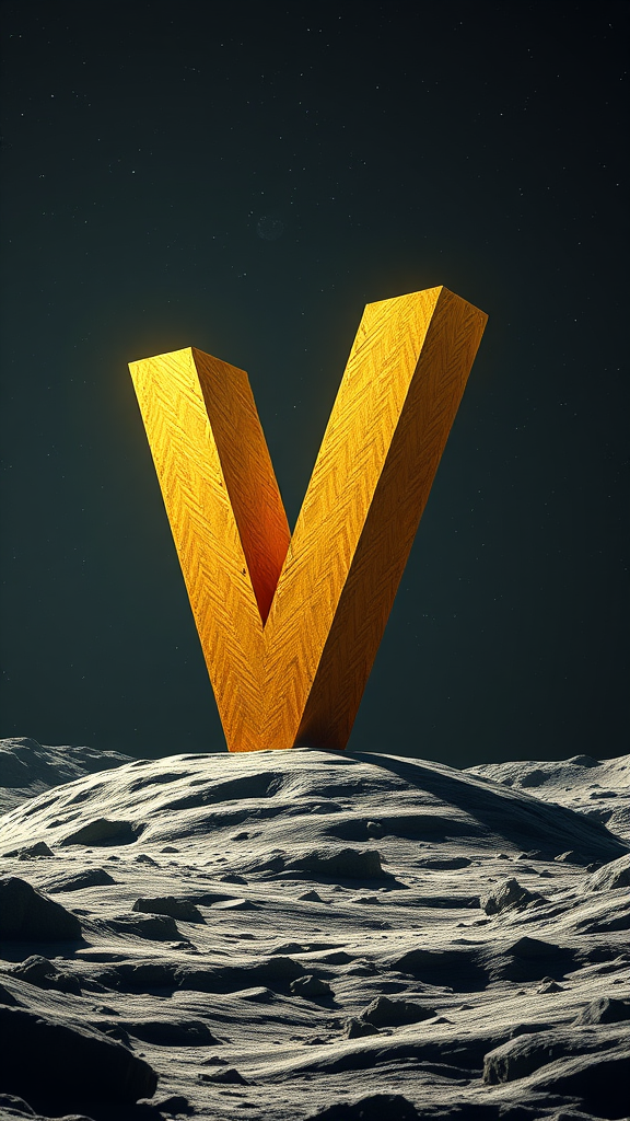 A towering, golden letter V majestically standing on the moon's surface, surrounded by the vastness of space as a backdrop. Under cinematic, high-contrast lighting, the lunar landscape and the letter's intricate 3D details are highlighted, creating an awe-inspiring ultra-realistic scene with a 2:3 aspect ratio. Subtle constellations twinkle in the distance, adding to the cosmic ambience.