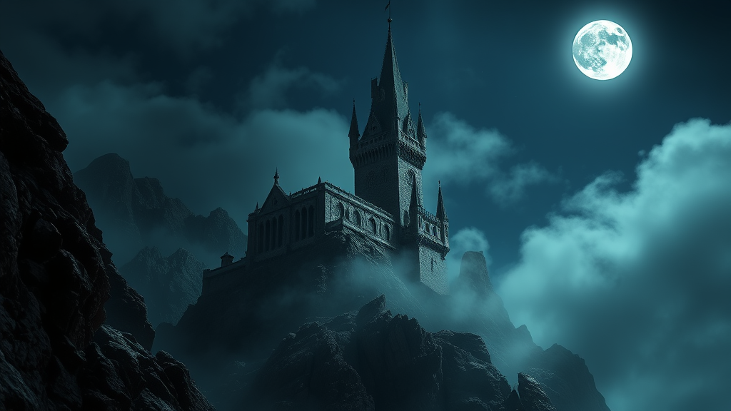 A towering gothic castle perched atop a rugged mountain, viewed from below under the light of a full moon, exuding a sense of awe and melancholy. The scene is embellished with intricate details and illuminated by an ethereal and magical cold light, casting long shadows across the rocky slopes. The atmosphere is shrouded in a chilling mist that enhances the castle's grandeur and mystery, evoking a world where dark enchantment and timeless beauty intertwine.