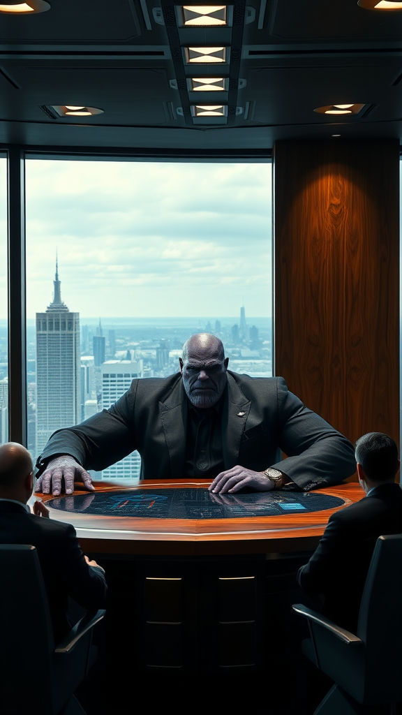 A towering, imposing figure of Thanos sits behind a massive mahogany desk in a sleek, modern high-rise office, the city skyline visible through the floor-to-ceiling windows. Dressed in an impeccably tailored dark suit, his eyes are fixed on a digital display of market trends, emanating a sense of calculated intensity. Dramatic shadows cast by strategically placed overhead lights accentuate his chiseled features and the grim determination etched on his face. Around him, an ambiance of power and inevitability envelops the room, as his team of advisors hover nearby, anxiously awaiting his next command in this high-stakes corporate chess game.