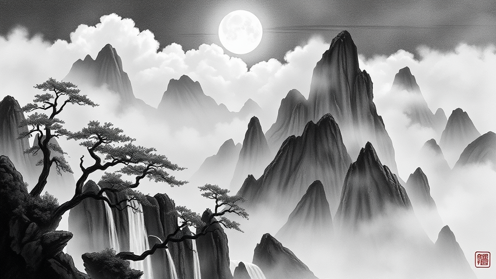 A towering landscape of mist-shrouded mountains in the style of suibokuga, where ethereal clouds weave through jagged peaks and delicate streams cascade gracefully down rock faces, trees with twisted forms cling to the cliff sides, their leaves a whispering sea of ink-wash strokes under a moonlit sky, in a vertical composition that emphasizes the tranquil majesty and sublime beauty of nature bathed in monochromatic shades.