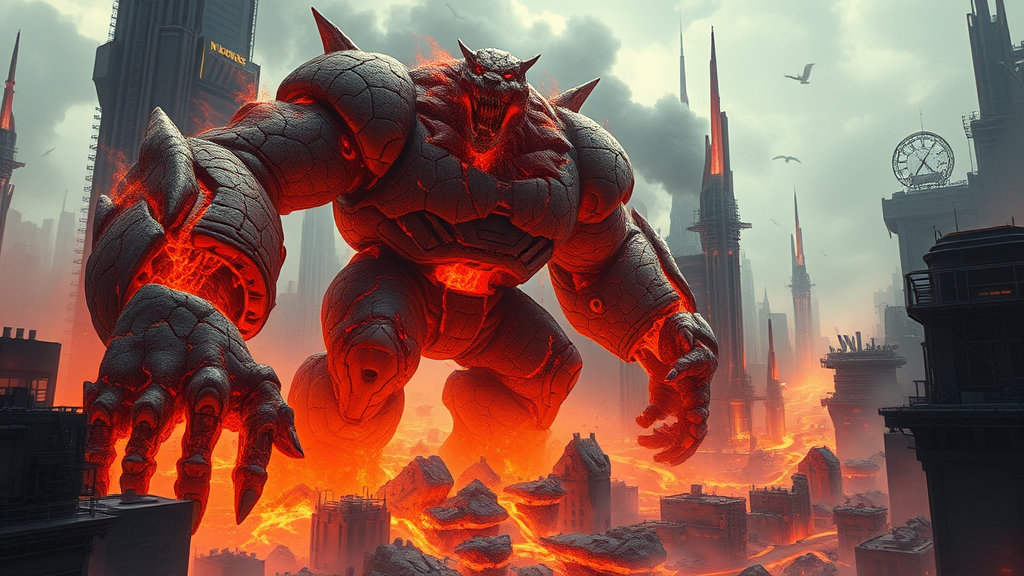 A towering molten lava golem, its fiery core glowing and swirling through the fissures in its rugged stone skin, rampages through a devastated futuristic cityscape. Seething lava traces crackling patterns across its frame as it slams blazing fists into towering skyscrapers, sending plumes of ash and smoke billowing into the sky. The intense heat scorches the surrounding structures, causing glass to melt and steel to warp, while streams of molten rock spill onto the streets, creating rivers of lava that carve through the urban landscape. Amidst the chaos, the golem's eyes burn with primal fury, illuminating the choking haze with an eerie glow, as it wreaks havoc in a world caught between elemental rage and advanced civilization.