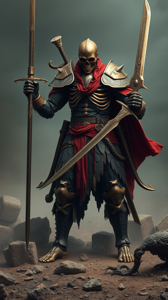 A towering Nordic warrior character brandishing mighty swords, styled in deep bronze and rich crimson hues, embodies a fractured, skeletal design that borders on haunting realism. Surrounded by dusty remnants, this figure exudes gothcore elegance, reminiscent of Dark Fantasy artistry by Antonio J. Manzanedo. The full-length portrayal reveals impeccably crafted armor, with weapons displaying intricate craftsmanship. The depiction offers hyper-detailed, ultra-realistic quality, capturing the warrior's essence in a four-dimensional perspective. Illuminated by dramatic, photographic lighting, the scene unveils an unparalleled level of detail and realism.