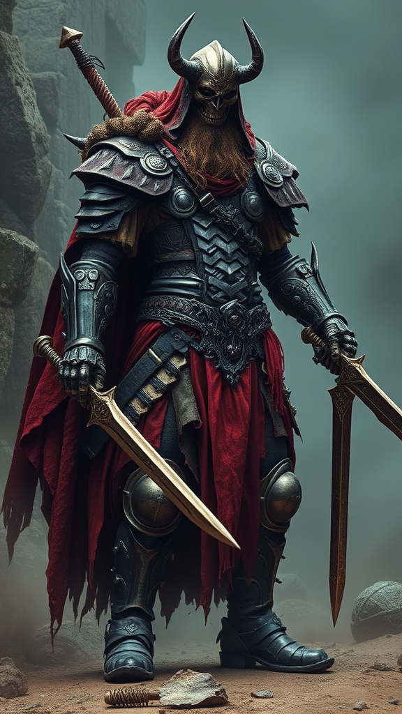 A towering Nordic warrior figure adorned with intricately detailed armor in dark bronze and crimson hues, wielding dual swords. The character exudes an otherworldly aura, captured in a crumpled, deconstructive style that highlights skeletal elements, evoking an eerily realistic presence amidst dusty surroundings. The gothic and dark fantasy aesthetic, akin to the works of Antonio J. Manzanedo, permeates the scene, showcasing a full-length view of the character. The armor and weapons feature elaborate and intricate designs, emphasizing hyper-realistic details that bring out a 4D dimension effect. Ultra-detailed textures are illuminated with dramatic, photography-style lighting, creating an immersive visual narrative in the highest quality.